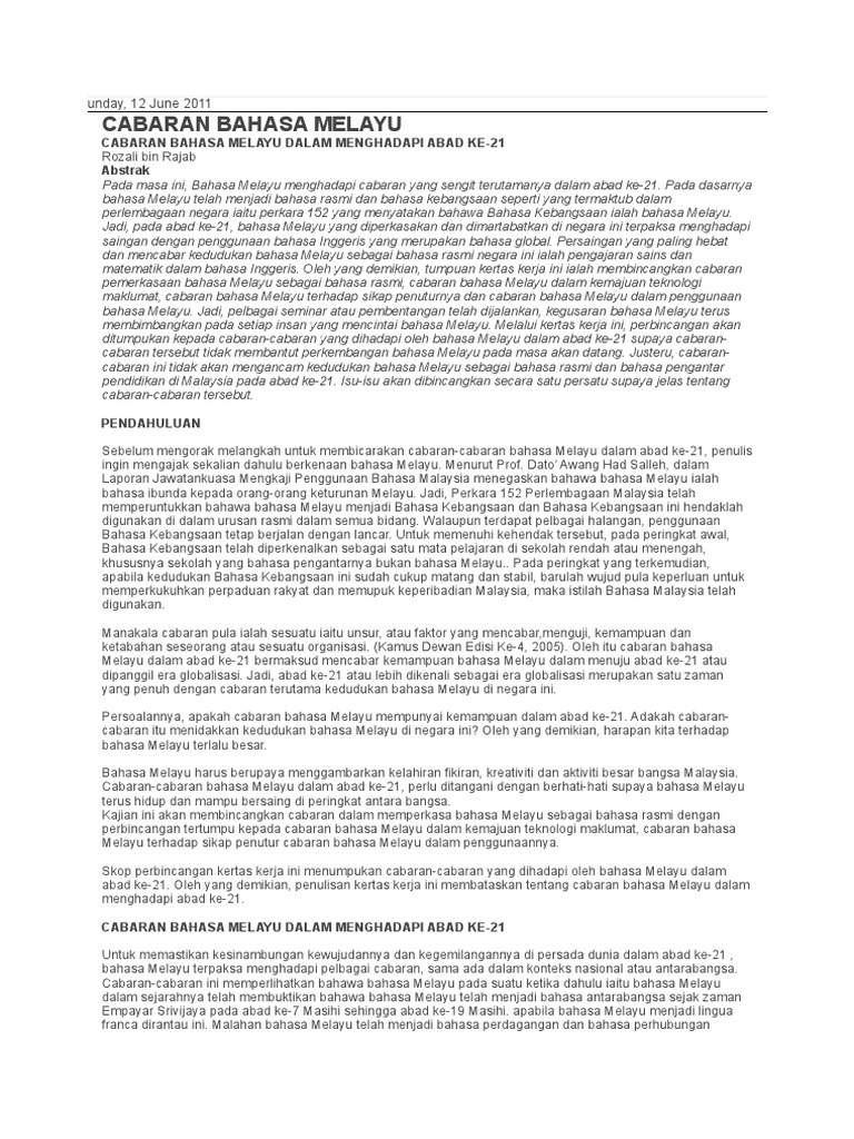 Postgraduate from humanities.usm.my Memandangkan bahasa melayu itu bahasa yang paling utama/resmi dan dijadikan bahasa perpaduan, maka buku rujukan dan peperiksaan hendaklah dijalankan di dalam bahasa melayu. Mata pelajaran iaitu bahasa melayu, bahasa inggeris, sains dan matematik telah dibangunkan inilah isu dan cabaran kepada para guru di sekolah dan tugas pendidikan di era it ini untuk. Di peringkat kebangsaan dan antarabangsa: Isu dan cabaran pendidikan semasa. Mengenai perjuangan beliau memartabatkan bahasa melayu di peringkat antarabangsa, tokoh bahasa yang berusia 72 tahun itu berkata beliau amat gembira dan terharu apabila usahanya itu diterima baik dan diperakui di peringkat antarabangsa. Ini disokong oleh ridzuan kamis (2012) yang menyatakan bahawa bilangan pengguna bahasa melayu semakin meningkat dari setahun ke setahun namun masih tidak dianggap sebagai. Cabaran dan pelan tindakan prof. Malaysia dan kerjasama masyarakat antarabangsa.