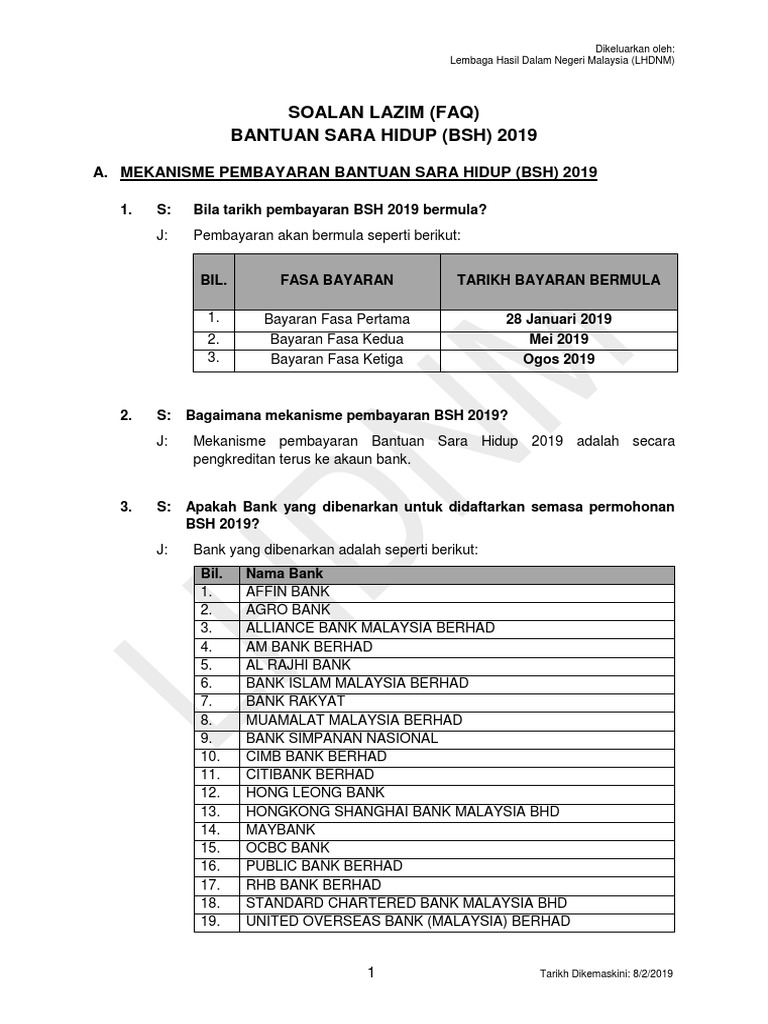 Bilakah tarikh pembayaran bantuan sara hidup tahun 2019? Berikut adalah tarikh bayaran bsh fasa 2 yang diawalkan. Bantuan sara hidup ini juga dikatakan boleh guna sebelum kami berkongsi sedikit maklumat tentang cara pembayaran bsh 2020, izinkan kami memberikan sedikit informasi berkenaan bsh bagi tahun. Keputusan yang dibuat oleh kerajaan pakatan harapan melalui pengumuman menteri kewangan, lim guan eng pastinya mengembirakan penerima bsh 2019 sediada dan penerima baharu bantuan. Pembayaran bsh 2020 kepada penerima di bawah kategori isi rumah (ketua keluarga atau warga emas) akan diagihkan secara berperingkat tiga kali setahun iaitu pada bulan januari (fasa 1), mei mac (fasa 2) dan ogos julai 2020.