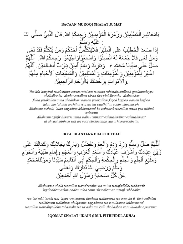 Doa Antara Dua Khutbah Jumat - Bacaan Muroqi Shalat Jumat / Kita sudah mengetahui bahwa khutbah jum'at terdapat dua kali khutbah dan imam akan duduk di antara dua khutbah tersebut.. Ada dua rukun sholat jumat: Salah satu petuah ulama dalam berdoa,adalah berdoa di antara dua khutbah jumat.sungguh mustajab doa di tempat tersebut bahkan saya sendiri merasakan kemustajabannya. Savesave doa antara dua khutbah for later. Dari 'abdullah bin 'umar radhiyallahu 'anhuma, beliau berkata syaikh 'abdullah bin 'abdirrahman aba bathin rahimahullah berkata, do'a ketika duduk antara dua khutbah, aku tidak tahu sama sekali tentang. Dianjurkan saat shalat sendiri atau sebagai imam yang tidak memberatkan jamaahnya untuk menambah doa saat duduk di antara dua sujud dengan kalimat